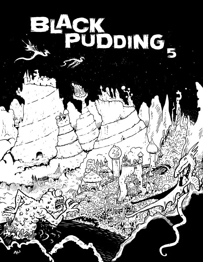 Black Pudding is a zine. No one can accurately define what a zine is. It’s just a thing you make when you want to be creative and you’re not concerned with high polish. Zines are kind of raw. This one is raw. It’s filled with drawings. Every page has art, usually lots of it. Many of the pages are lettered by hand, so they look like some young dude’s D&D notebook he scrawls in at school when he should be doing his math. That was me. I was that young dude. But lest I fall into the trap of diminishing my own work, rest assured the scrawlings in this zine are not purely wild and unrefined. I work hard on these pages. I want them to look good, and I think they do.